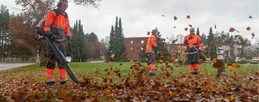 - Ulkotyöt kausittain: Lumityöt, liukkauden torjunta, haravointi, viheralueiden hoito